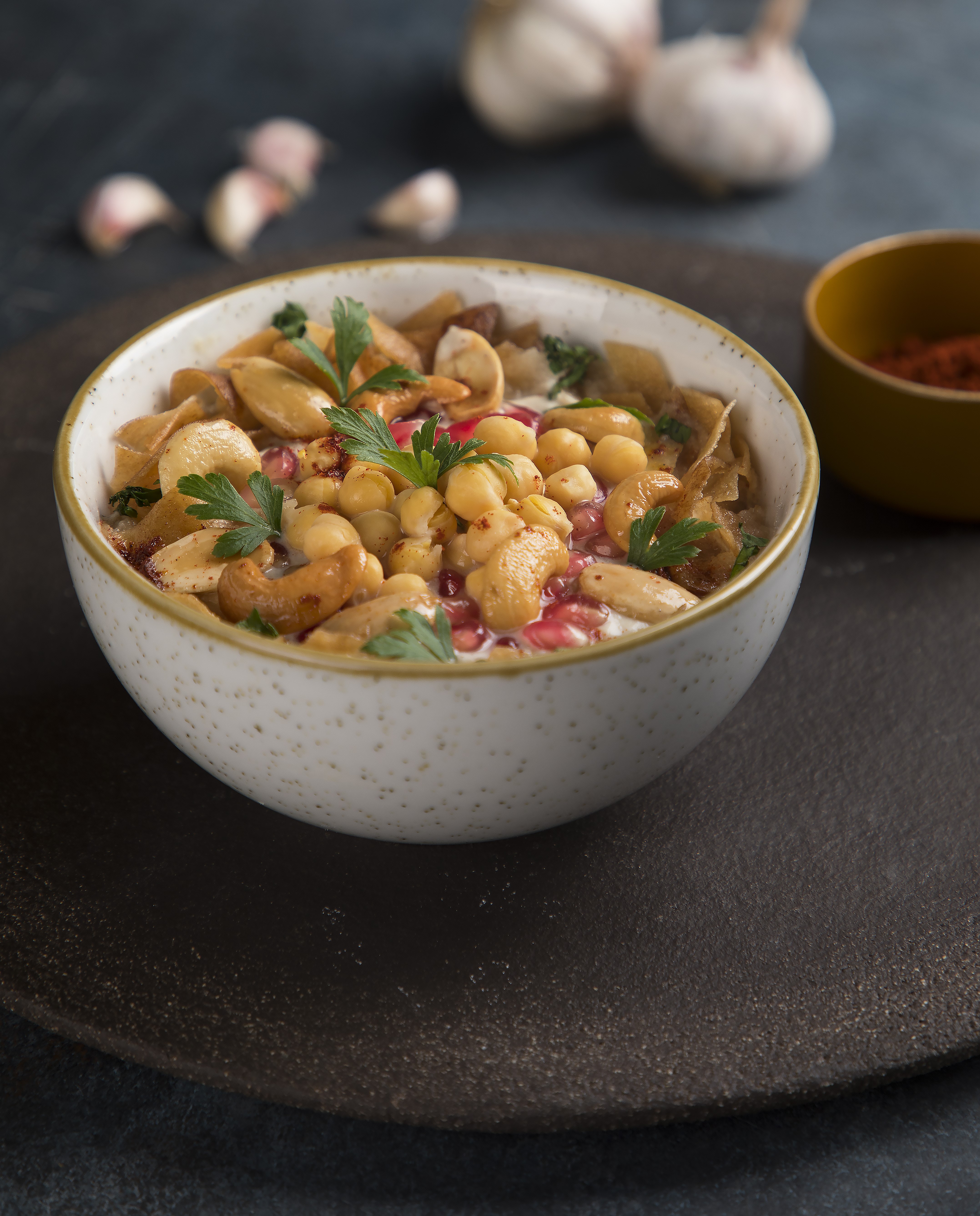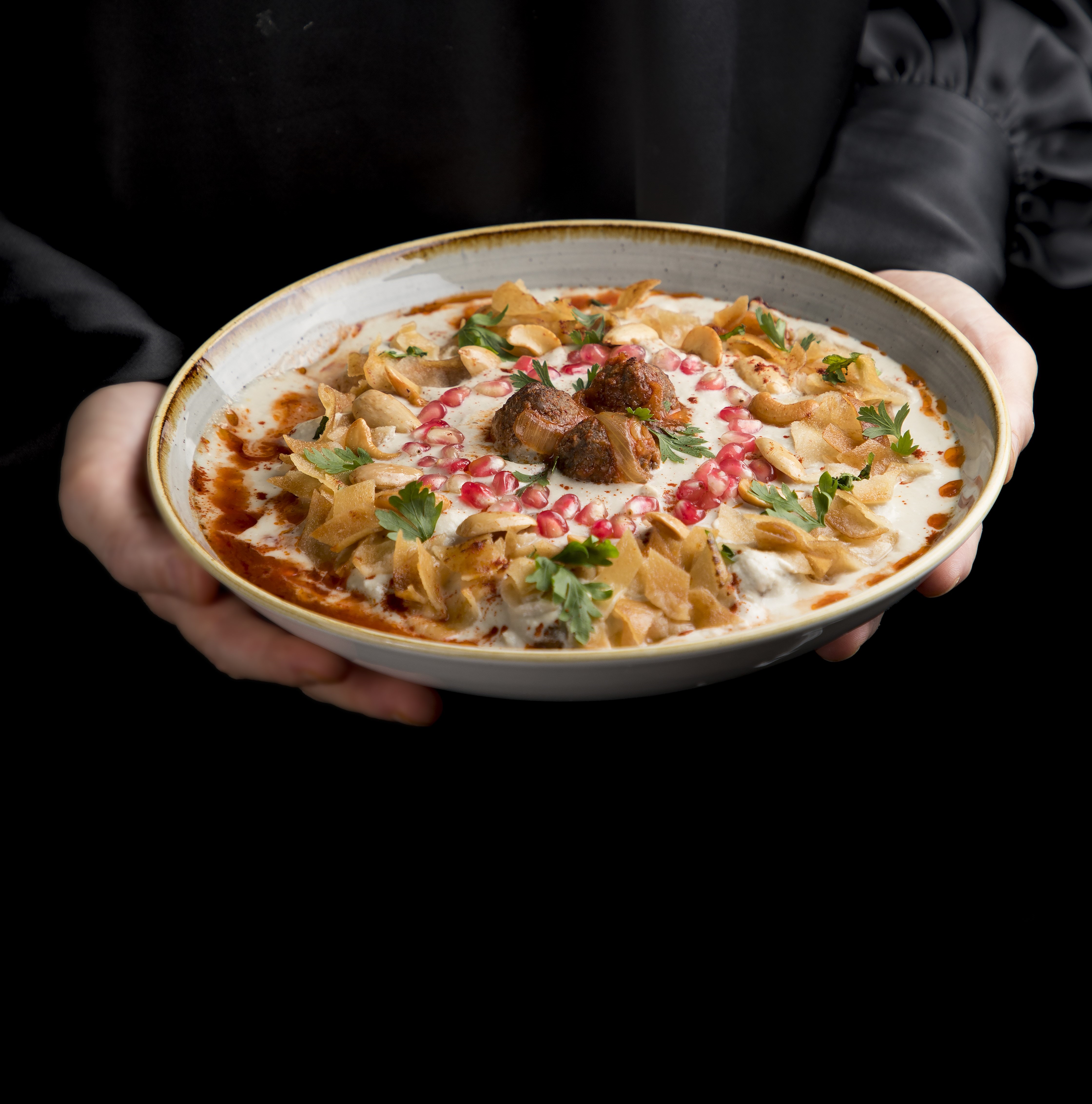 "Fatteh" is a traditional Levantine dish that features layers of crispy bread, often toasted or fried pita, combined with a mix of yogurt, chickpeas, fried vegetables like eggplant or cauliflower , and sometimes meat, such as lamb or chicken. It's typically garnished with nuts, fresh herbs, and a drizzle of ghee