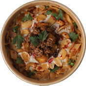 "Fatteh" is a traditional Levantine dish that features layers of crispy bread, often toasted or fried pita, combined with a mix of yogurt, chickpeas, fried vegetables like eggplant or cauliflower , and sometimes meat, such as lamb or chicken. It's typically garnished with nuts, fresh herbs, and a drizzle of ghee
